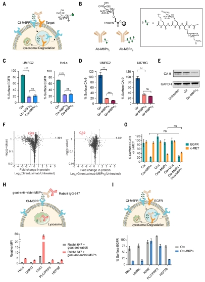 图片摘要:鉴定LYTAC介导的膜蛋白降解的细胞决定因素研究内容:1. 包含抗体-糖肽偶联物的下一代 LYTAC 的设计。为了推动机理研究,研究团队首先开发了合成可扩展的下一代LYTAC分子。鉴于第一代LYTAC分子M6Pn-糖聚合物的异质性可能导致批次间差异和阻碍LYTAC分子精确分子性质的表征,研究人员开发了均相肽,并将其融入标准固相肽合成工作流程中,以便更好地控制抗体-肽偶联物的结构组成(图1B)。CTX-M6Pn5和 Ctx-M6Pn2在UMRC2和HeLa细胞中降解了~80%的细胞表面EGFR(图1C)。为了扩大靶向膜蛋白的范围,团队将肽分别与吉伦妥昔单抗(Gir)和奥那珠单抗(Ona)偶联,这两种抗体分别针对碳酸酐酶IX(CA9)和c-Met。GIR-M6Pn5和Gir-M6Pn2在UMRC2细胞中能够降解大于80%的表面CA9,在U87MG细胞中降解70%至80%(图1D)。他们证实Gir-M6Pn2降解了CA9(图1E),通过定量蛋白质组学证明CA9的下调具有高度选择性(图1F)。最后,团队通过验证可以同时降解两个不同的膜靶点证明了CI-M6PR诱导的降解不存在容量限制(图1G)