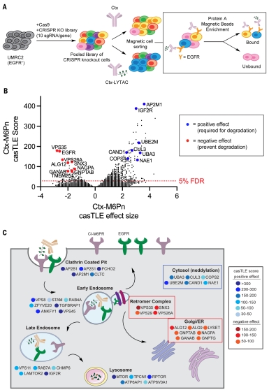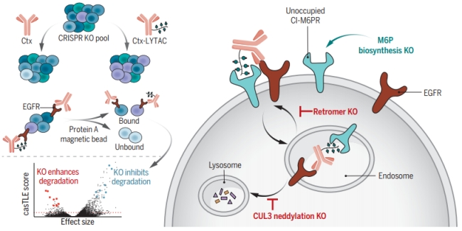 图1. 包含抗体-糖肽偶联物的LYTAC能够降解膜靶标2. 基于磁性细胞分选的全基因组CRISPR筛选,确定LYTAC介导的降解的关键调节因子。为了深入研究膜蛋白降解,团队设计了一种使用磁富集的全基因组CRISPR缺失筛选方法。首先,作者构建了用全基因组单向导RNA(sgRNA)敲除文库感染的UMRC2-Cas9细胞,并分别用Ctx或Ctx-M6Pn处理这些细胞。随后,作者利用蛋白A磁珠来分离EGFR阳性细胞和阴性细胞。当用 Ctx-M6Pn 处理通过 CRISPR 介导的基因敲除细胞时,失去降解 EGFR 能力的细胞会保留在结合部分中,而失去细胞表面 EGFR 的细胞保留在未结合部分。通过下一代测序分析这些富集的组分,以确定 LYTAC 介导的膜蛋白降解所需的基因(图2A)。通过分析,作者团队发现“逆转录复合物”、“CUL3-RING 泛素连接酶”和“蛋白neddylation”是 LYTAC 介导的 EGFR 降解的富集特异性途径(图2C)。内质网(ER)和高尔基体中逆转录复合体复合物、neddylation途径和M6P生物合成相关的基因均对LYTAC介导的降解有显著影响,但没有明确的机制基础。
