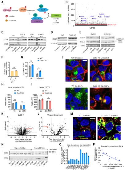 图3. 破坏逆转录酶复合物基因通过减少LYTAC–CI-M6PR复合物的循环来增强CI-M6PR介导的靶标降解。4.CUL3 的类泛素化是LYTAC 介导的膜蛋白降解的关键和预测标志物。团队发现了几个相关性高的基因,这些基因参与了E3 连接酶 cullin-3 (CUL3) 的类泛素化和激活。在激活过程中,Nedd8 从E1转移到E2,然后转移到E3连接酶(CUL3)。失活的CUL3通常与CAND1结合,并且在类泛素化时,CAND1解离激活的CUL3(图4 A)。所有这些组分,包括 CUL3,都被鉴定为对 Ctx-M6Pn 介导的降解具有积极作用的因素,表 明CUL3的类泛素化对LYTAC介导的降解很重要(图 4B)。该通路中的基因(CUL3、UBA3、CAND1)的敲除证实EGFR 的降解依赖于功能性E3类泛素化系统(图4C)。在CUL3缺陷细胞中c-MET的降解也减弱了,表明CUL3的作用不是靶标特异性的(图4D)。团队还验证了CUL3的类泛素化对于内源性机制的EGFR下调是可有可无的,但对于LYTAC介导的EGFR降解是必需的(图4E)。此外,作者证明,在CUL3缺陷细胞中,LYTAC的结合和内化没有改变,因此CUL3 活性是 LYTAC 介导的内化的下游。为了进一步研究此效应,团队观察了 LYTAC 处理 72 小时后 EGFR 的定位,发现 EGFR 部分集中在 CUL3 缺陷细胞的 LE/LY 囊泡中,而 EGFR 在 WT 细胞中大部分被降解,这表明CUL3在LYTAC介导的靶标从内体成熟到溶酶体降解中起着重要作用(图F-J)。为了了解CUL3如何调节核内体向溶酶体的成熟,作者通过免疫共沉淀蛋白质组学鉴定了neddylated CUL3的相互作用分子,最显著的分子是SQSTM1(图4K和L)。在SQSTM1 KO细胞中,LYTAC降解EGFR的能力降低(图S18 B-D)。在CUL3 KO细胞中,SQSTM1与Ctx-M6Pn共定位(图4M)。CUL3 neddylation修饰对LYTAC活性的关键作用,因此作者比较了11种细胞系的类泛素化CUL3表达水平和EGFR降解能力,发现类泛素化CUL3表达水平较高的细胞系对EGFR的降解更好(图4N-P),表明类泛素化CUL3水平可以作为LYTAC介导的膜蛋白降解的预测标志物。