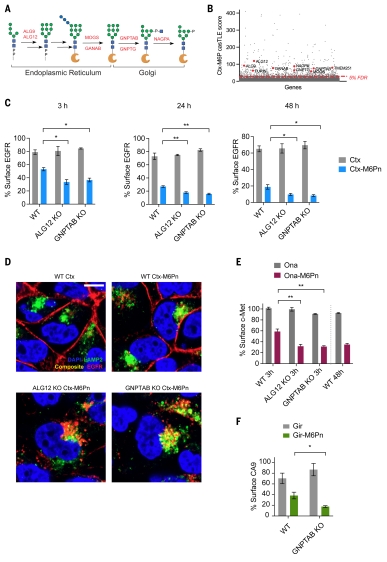 图4. CUL3的类泛素化对CI-M6PR介导的靶溶酶体降解至关重要。5.M6P生物合成基因的破坏增强了LYTAC的功效。溶酶体水解酶在内质网中合成并转运到 TGN,在那里用 M6P 修饰。TGN 中的 CI-M6PR 可识别 M6P 修饰的溶酶体蛋白,并将其转运至晚期内体,最终实现溶酶体递送。团队鉴定了几种参与 M6P 糖蛋白生物合成途径的具有负效应的糖基转移酶,并鉴定了跨膜蛋白251(TMEM251)或溶酶体酶转运因子(LYSET)是M6P修饰和溶酶体水解酶转运的关键蛋白(图5 B)。Ctx-M6Pn 介导的降解在 ALG12 或 GNPTAB 缺陷细胞中增强(图5 C),共聚焦显微镜显示,在LYTAC处理后,一些EGFR仍保留在WT细胞的细胞表面,而在ALG12或GNPTAB缺陷的细胞中,EGFR几乎从细胞表面耗尽(图5D),这些细胞中,LYTAC处理后,没有检测到任何表面结合的EGFR,这表明靶标-LYTAC-CI-M6PR复合物的内化增强。经过验证,M6P生物合成的破坏增强了跨多个膜靶标的LYTAC活性。