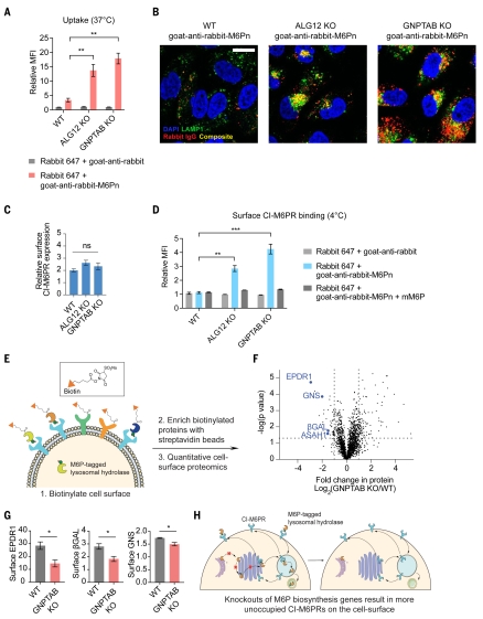 图5. 敲除M6P生物合成基因可增强LYTAC的功效。6. M6P生物合成减弱CI-M6PR细胞表面可及性为了阐明M6P生物合成基因的破坏如何提高LYTAC的功效,作者首先评估了摄取,ALG12和GNPTAB KO细胞的摄取显著增加,且内化的货物与溶酶体共定位(图6,a和B)。ALG12或GNPTAB缺失并未导致表面CI-M6PR表达的显著差异(图6C)。接着,作者检测了LYTAC与细胞表面的结合情况。在ALG12和GNPTAB KO的细胞中,LYTAC与细胞表面的结合较高,并且通过与抑制性单体M6P共同处理可减弱LYTAC与细胞表面的结合,这表明这种结合是CI-M6PR依赖的(图6D)。因此,CI-M6PR在稳态下被M6P修饰的蛋白占据。破坏M6P生物合成基因增加了细胞表面可结合的CI-M6PRs的比例,从而增强了LYTACs的内化(图6H)。