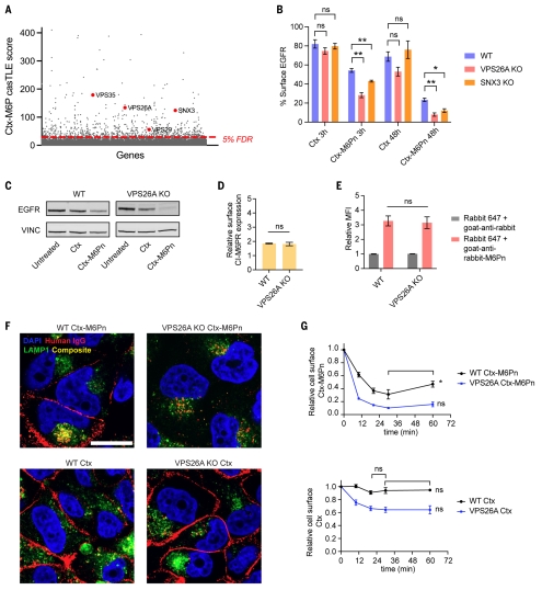 图2. 全基因组CRISPR KO筛选鉴定LYTAC介导的膜蛋白降解的调节因子。3.逆转录复合物基因的破坏通过减少从内体到质膜的再循环来增强 LYTAC 介导的降解。逆转录复合体参与从内体向反式高尔基体网络(TGN)或质膜的逆行运输。逆转录蛋白复合物的核心成分,如液泡蛋白分选相关蛋白 35 (VPS35)、液泡蛋白分选相关蛋白 26A (VPS26A)、分选连接蛋白 3 (SNX3) 和液泡蛋白排序相关蛋白 29 (VPS29),从筛选中被鉴定为阴性相关因素(图3A)。团队探究了敲除这些基因是否会改善LYTAC介导的蛋白降解。结果显示,VPS26A 或 SNX3 缺陷细胞中 EGFR 的降解明显更大,这表明当逆转录基因被破坏时降解更有效(图3B, C)。共聚焦成像显示,EGFR定位于晚期内体或溶酶体(LE/LY)和野生型(WT)细胞的质膜上,而在LYTAC处理后,在VPS26A缺失细胞的细胞表面上大多检测不到EGFR,表明VPS26A的缺失不会改变CI-M6PR的表面表达水平(图3D)。由于逆转录复合物参与回收内体中的货物,因此在 LYTAC与受体解离之前,部分LYTAC-CI-M6PR复合物可被回收。WT细胞中,LYTAC定位于质膜并部分定位在LE / LY中,而没有观察到LYTAC在VPS26A KO细胞的细胞表面定位(图3F),因此团队得出结论:LYTAC可以通过逆转录复合物从内体回收回质膜,而当逆转录复合物中的组分被破坏时,这种回收就会减少。在WT和VPS26A缺陷细胞中,团队观察到Ctx仍然与细胞表面的EGFR结合(图3F和G),因此,团队认为在LYTAC与受体分离之前,逆转录酶复合物可以回收LYTAC–CI-M6PR复合物,并且逆转录酶基因的扰动可以通过去除CI-M6PR的竞争性回收途径来提高LYTAC的功效。