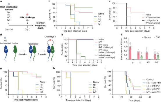 Nature|分室化眼部淋巴系统介导眼脑免疫 大家好,今天给大家分享的是2024年2月发表在Nature上的“Compartmentalized ocular lymphatic system mediates eye-brain immunity”。 通讯作者:该研究论文的通讯作者为耶鲁大学的Eric Song。 研究概要: 眼睛是中枢神经系统(CNS)的解剖学延伸,与大脑有许多分子和细胞相似之处。新兴研究表明,大脑的变化通常反映在眼睛中,尤其是在视网膜中。尽管如此,眼后部和其他中枢神经系统组织之间免疫学联系的可能性仍未被探索。 单纯疱疹病毒(HSV)具有影响许多组织的倾向,包括多个神经组织,如背根神经节、眼睛和大脑,并且是全球散发性致命性脑炎的最常见病因。在研究大脑中对单纯疱疹病毒的免疫反应中,作者观察到玻璃体内免疫可以保护小鼠免受颅内病毒攻击。这种保护延伸到细菌甚至肿瘤。 眼睛的前部和后部存在不同的淋巴引流系统,后部通过视神经鞘中的淋巴管系统与脑膜淋巴管相连接,共享淋巴回路,在眼睛后部和大脑之间建立了统一的免疫反应。能够在后眼和大脑之间建立统一的免疫反应,突出了眼睛未被充分研究的免疫学特征,并为眼部和中枢神经系统疾病的开辟了新治疗策略。 研究内容: 1、后眼中的抗原在大脑中引起免疫反应 为了了解大脑中对HSV的保护性免疫,作者通过四种给药途径给小鼠接种热灭活HSV-2——腹腔内(ip)诱导全身免疫,颅内(ic)诱导局部脑免疫,前房内(AC)和玻璃体内(后房(IVT))——最后两种给药途径中的前房和玻璃体是与神经系统有独特解剖联系的眼隔间(图1a)。在致命的ic。 HSV-2攻击后,所有接受ip免疫的小鼠都死于感染,而ic免疫保护了大约80%的小鼠(图1b),表明全身免疫不足以提供针对中枢神经系统感染的保护。值得注意的是,IVT免疫也可以保护小鼠,但所有AC免疫小鼠都死亡 (图1b),这表明IVT免疫在大脑中驱动保护性免疫反应。 作者推断眼脑轴的免疫反应与其他器官的情况一样,必须由局部淋巴结(LN)介导。为了研究IVT免疫后促进大脑保护的细胞机制,作者首先通过手术结扎颈深部淋巴结(dCLN)的淋巴管,这是引发大脑免疫反应的关键。这完全消除了IVT免疫提供的保护,表明局部中枢神经系统LN回路将抗原排入dCLN的重要性(图1c)。同时,补充数据通过免疫记忆相关实验,证明IVT免疫在dCLN中产生局部抗原特异性CD4 T和B细胞应答是宿主抗病毒中枢神经系统保护所必需的。 为了进一步解决IVT免疫介导的保护是否在大脑局部发展,作者设置了具有不同免疫状态的异种小鼠对(图1d)。当IVT免疫小鼠与未免疫小鼠配对时,只有最初免疫的小鼠(左)而不是它们的异种伴侣(右)能够抵抗ic的病毒攻击(图1e)。此外,通过检测不同免疫途径抗HSV抗体的定位,作者发现,尽管所有免疫途径都导致血清中存在抗HSV -2抗体,但只有通过ic和IVT免疫的小鼠脑脊液中可检测到抗HSV -2抗体(图1f)。这些数据表明,IVT免疫通过局部抗体依赖反应独特地介导中枢神经系统保护。 最后,为了确定这种眼脑轴介导的中枢神经系统保护是否不止局限于HSV-2,作者研究了类似疫苗接种策略对单纯疱疹病毒-1(HSV-1)和肺炎链球菌的疗效。用热灭活的HSV-1或肺炎链球菌通过ip、ic、AC或IVT途径免疫小鼠,30天后再用致死剂量的相同病原体进行免疫。与HSV-2模型的结果相似,IVT和ic免疫小鼠的数据显示它们几乎具有完全的保护作用。相比之下,所有未接种、ip免疫和AC免疫的小鼠都死亡 (图1g-h)。这些数据表明,眼脑轴免疫与许多中枢神经系统疾病具有特殊的相关性和广泛的适用性。