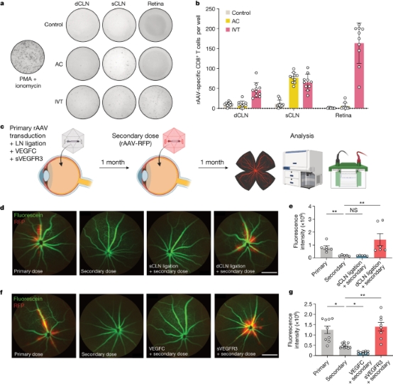 图3. 视神经鞘淋巴管引流后眼 4、通过眼部淋巴管增强基因治疗 在确认了后眼引流的免疫学重要性后,作者接下来研究了利用这一发现的潜在治疗应用。rAAV(腺病毒载体)是最常见的体内基因递送载体,因为它们具有安全有效的转导作用,然而对rAAV的获得性免疫限制了其重复给药的功效。作者首先使用ELISpot测定法表征了AC和IVT施用rAAV后LN和视网膜中rAAV特异性CD8 T细胞诱导。尽管AC和IVT注射在 sCLN中诱导了相似数量的rAAV特异性CD8 T细胞,但IVT注射特异性地在dCLN和视网膜中诱导了更多rAAV特异性CD8 T细胞,这在AC注射后未观察到(图4a-b)。作者推断,视神经淋巴引流有助于对rAAV的免疫反应,特别是对于基于视网膜的治疗方法,从而限制了其效用。为了测试这一点,作者首先给予了第一剂的 rAAV,1 个月后,给予了第二剂表达 RFP 的 rAAV (rAAV-RFP)。同时,在第二次给药时给予幼稚小鼠rAAV-RFP作为基线对照(图4c)。继发感染后的RFP表达水平明显低于初次感染后的RFP表达水平(图4d-e)。sCLN或dCLN结扎后进行的实验证实了眼淋巴血管的重要性,表明只有dCLN结扎才能减轻对rAAV的免疫反应并恢复继发性rAAV-RFP转导效率。由于手术结扎淋巴结不是治疗上可行的选择,作者使用了另一种方法来抑制淋巴管的分子活性:IVT给药sVEGFR3,作者发现其抑制淋巴引流的程度与手术结扎相似。作者发现,VEGFC的存在进一步加剧了对rAAV的免疫反应,而使用sVEGFR3抑制VEGFC信号可以使第二次给药与原发性感染一样有效(图4f-g)。这些实验确立了后眼淋巴管在调节基于rAAV的基因疗法疗效中的作用,并提出了一个平台来克服当前限制重复基因治疗的障碍。