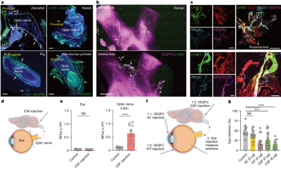 图2. 眼睛有一个分室的淋巴引流系统 3、视神经鞘包含功能性淋巴管 大分子于LN的定位不同表明,淋巴血管网络可能介导这些隔室的引流。虽然最近的一项研究描述了小鼠眼淋巴系统的存在,且类似于大脑的淋巴系统,但介导玻璃体引流的淋巴管功能网络尚未得到解决。因此,作者使用转录组学方法以及iDISCO (一种组织透明成像技术)来获得与不同脊椎动物视神经相关的淋巴血管网络的全局图。 除了在小梁网和视网膜中含有表达淋巴样基因特征的巨噬细胞外,作者还发现视神经鞘中也含有淋巴样基因特征。与此同时,iDISCO展示了覆盖斑马鱼、小鼠、兔、猪、非人灵长类动物和人类视神经的淋巴管,证明了淋巴系统的进化保守特征(图3a-b)。在所有哺乳动物中,作者都发现了 LYVE1 和血管内皮生长因子受体3 (VEGFR3)共定位染色的血管结构。 值得注意的是,淋巴脉管系统是在神经周围的膜上,而不是神经本身。 为了提高染色的敏感性,作者从视神经中解剖了视神经鞘。作者在摘除前进行了灌注固定,保留了沿神经的淋巴网络的解剖结构,避免视神经鞘在摘除后会缩回。作者利用具有良好特征的耳淋巴系统作为对照组,使用额外的标记(VEGFR3,PROX1,LYVE1,CD31和podoplanin)验证了视神经鞘淋巴管的存在。为了使用遗传方法进一步表征这些脉管系统,作者使用了两种不同的报告小鼠,能够对淋巴管进行高度特异性染色。这些并行方法共同证实了视神经鞘中确实存在淋巴管。 然后作者尝试评估这些淋巴管的功能。在IVT注射荧光示踪剂后(但不是AC注射),示踪剂在沿着视神经的 VEGFR3+ 脉管系统中可见。注射的LYVE1抗体可以有效地标记视神经鞘淋巴管,这表明像蛋白质这样的大分子可以从玻璃体中自由渗透到这些淋巴管中。作者的主要假设是是基于对大脑的硬膜淋巴管的理解,认为来自眼睛的分子通过脑脊液进入视神经鞘淋巴管,类似于分子从大脑移动到硬脑膜淋巴管的方式。为了测试这一点,作者检查了IVT注射后染料和抗体的分布。在静脉注射后,作者检测到CSF的微量染料,而脑内注射后,作者发现脑脊液含有微量的染料。此外,IVT路线注射的抗体不能充分标记硬脑膜淋巴管。这些数据表明,静脉注射染料可能进入了视神经上的局部脑脊液空间,并没有通过脑硬膜脑膜排至 dCLN。为了分析大分子如何进入视神经鞘周围的淋巴管,作者探究了注入玻璃体的分子是如何离开眼睛的。在IVT AF647-OVA注射后,作者观察到存在流向视神经乳头的定向流。 眼睛切片的高分辨率检查显示,示踪剂主要集中在视神经头,有一些扩散通过视网膜。通过视网膜的扩散显示了一种类似于先前描述的视网膜淋巴细胞模式——一种横跨视网膜的细胞旁垂直条纹。 为了验证这些淋巴管引流玻璃体的能力,作者通过三种不同的方式递送血管内皮生长因子 C (VEGFC,一种淋巴刺激器): AC、IVT、小脑池内(ICM;针对视神经)。首先,作者通过荧光示踪剂证实了ICM注入的示踪剂只能到达视神经,而不能到达眼睛(图3d-e)。VEGFC 递送两天后,通过 IVT 途径注射荧光右旋糖酐,并在12小时后分析保留情况。通过AC递送VEGFC并没有改变玻璃体中葡聚糖的引流情况,表明前淋巴刺激不足以驱动玻璃体引流。相比之下,VEGFC 的 IVT 和 ICM 给药增加了玻璃体中葡聚糖的引流,而后者是以剂量依赖性方式(图3g),支持了眼睛后室通过视神经上的淋巴脉管系统引流至 dCLN 的观察结果。为了进一步证实 VEGFC 在调节视神经鞘淋巴管中的作用,作者还通过 IVT 途径分别递送重组腺相关病毒rAAV-VEGFC 和可溶性血管内皮生长因子受体3 (sVEGFR3),发现 VEGFC和sVEGFR3在视神经鞘淋巴管系统中的表达显着增加或降低。总之,这些数据表明视神经鞘上存在功能性淋巴管网络,该网络将后眼连接到一组独立于眼睛其他部分但与中枢神经系统其他部分共享的淋巴结。