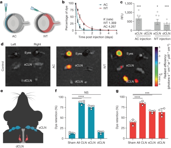 图1. 后眼中的抗原在大脑中引起免疫反应 2、眼睛有一个分隔的引流系统 作者的免疫研究揭示了AC和眼玻璃体之间的不同免疫反应。一般认为,房水通过包括施莱姆管和小梁网在内的常规流出通道从房水室流出,眼后腔室(尤其是玻璃体)的引流尚不清楚。 为了研究眼球前后不同的引流系统,作者通过AC或IVT途径注射荧光标记的葡聚糖,并量化葡聚糖保留的动力学(图2a)。IVT给药后葡聚糖清除率(K=1.369)明显低于AC给药后(K=4.267;图2b)。这一观察结果可以用两种可能性来解释:要么隔室有独特的引流路径,要么每个隔室的引流限速步骤不同(即通过玻璃体的扩散可能是最慢的步骤)。作者认为这些可能的解释可以通过观察染料在体内的定位来解析。与IVT注射后相比,AC注射后血液中检测到的染料浓度明显更高。注入AC的染料定位于同侧sCLN,而IVT注入的染料除了定位于同侧sCLN外,还定位于双侧dCLN(图2c-e)。AC注射后结扎sCLN,而非dCLN,可显著增加眼内染料潴留(图2f)。对于IVT注射,单独结扎sCLN或dCLN都会导致眼睛中染料潴留增加(图2g)。这些结果证明了眼内AC和玻璃体间有一个分隔的引流系统,而从玻璃体到dCLN有一条特定的途径。