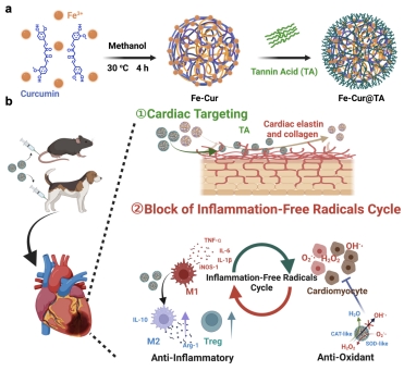 图2: Fe-Cur@TA制备过程和心脏靶向阻断过度炎症自由基恶性循环治疗心肌梗死的应用。