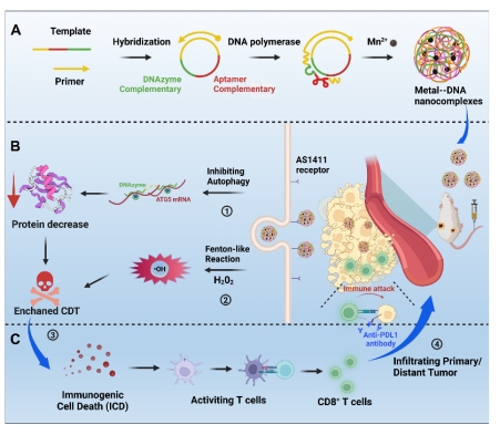 化学动力学疗法(Chemodynamic Therapy,CDT),是一类基于肿瘤细胞自身内源性化学产物转化反应的新型肿瘤特异性治疗技术,为临床肿瘤治疗提供了新的研究范式。然而,自噬(autophagy)作为关键的癌细胞自我保护机制严重削弱了CDT的肿瘤治疗效果。对此,分子医学研究院杨宇团队联合同济大学杨洋团队开发了一种新型金属-DNA自组装体(DACs-Mn),通过DNA酶特异性识别和切割肿瘤细胞自噬RNA片段,实现了对肿瘤自噬保护的抑制,从而增强CDT的肿瘤治疗效果(图4)。DACs-Mn是由Mn离子和滚环扩增反应合成的功能性长单链DNA自组装而成。长单链DNA包含有精心设计的多聚AS1411核酸适体和DNA酶功能序列。其中AS1411核酸适体可特异性结合高表达核仁素的肿瘤细胞,增强了肿瘤的摄取。内吞的纳米自组装体在酸性条件下可释放出Mn2+离子,利用H2O2生成羟基自由基(?OH)进行化学动力治疗。一同释放的长单链DNA结构中的DNA酶序列则在Mn2+离子存在的情况下特异性地切割自噬基因ATG5 mRNA,降低了肿瘤细胞自噬水平,从而阻断了自噬对CDT氧化应激的抑制,最终实现了自噬抑制增强的CDT肿瘤治疗效果。有意思的是,利用DACs-Mn增效的CDT能够诱导肿瘤细胞产生免疫原性死亡,从而释放出肿瘤抗原以激活免疫系统。DACs-Mn和免疫检查点阻断的联合治疗不仅抑制了原发性肿瘤的生长,还对远端转移性肿瘤产生了良好的抑制效果。