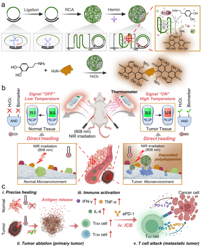 5. 基于智能DNA纳米反应器的在体肿瘤简易成像与精准治疗|Angewandte Chemie 肿瘤影像学对于肿瘤定位、手术指导和预后监测至关重要。尽管纳米技术的进步促进了光热成像、光声成像、核磁共振成像和多模态成像等各种肿瘤影像技术的发展,但它们仍然受到特异性和成本效益的限制。i)不智能的“始终开启”或单参数响应信号输出以及显著的脱靶效应导致难以区分肿瘤组织信号与正常组织背景;ii) 现有的诊断策略,如磁共振成像、正电子发射断层扫描等价格昂贵。因此,如何发展一种特异性强,且具有成本效益的理想肿瘤影像策略,实现智能且易于读取的在体肿瘤成像是一个重要的研究方向。为了解决这些问题,上海交通大学分子医学研究院杨宇教授与同济大学附属第十人民医院朱小立研究员团队通过充分利用肿瘤与正常组织的微环境差异,开发了一种用于肿瘤在体简易成像与精准治疗的智能DNA纳米反应器(iDNR)。 iDNR是一种被合理设计的多功能DNA多聚物,兼具结合肿瘤标志物核仁素的核酸适体功能,响应肿瘤微环境过氧化氢(H2O2)的酶促催化活性,两种功能共同构成了多个参数响应的“AND”逻辑门,能够智能催化光热物质聚多巴胺(PDA)在肿瘤部位的选择性沉积。基于这一设计,iDNR成功实现了基于温度计的肿瘤在体简易成像,并展示了与流式细胞术和光声成像相媲美的性能。此外,iDNR对肿瘤组织的高度选择性还被成功用于实现精准的肿瘤光热治疗(PTT),通过智能加热肿瘤组织来杀灭肿瘤。iDNR介导PTT激活免疫结合免疫检查点阻断(ICB)治疗,能够进一步抑制远端肿瘤的生长。